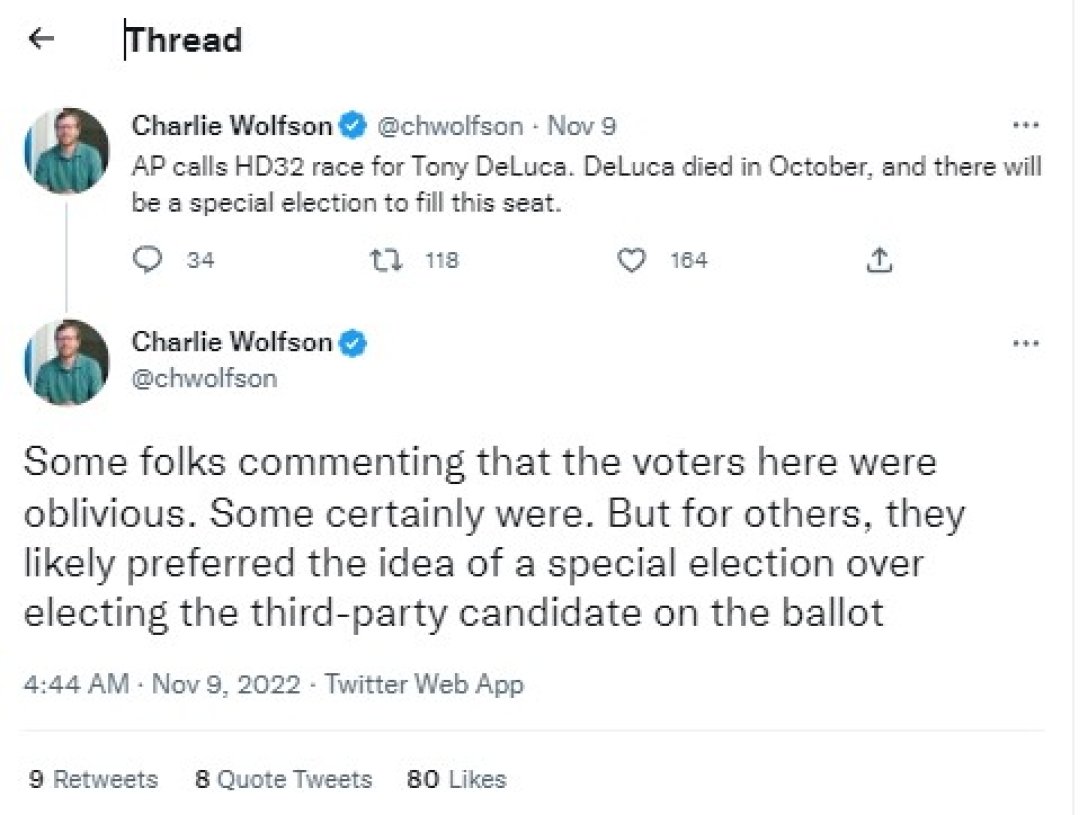 Журналист Чарли Вольфсон в связи с этой ситуацией написал, что некоторые избиратели могли не знать о смерти ДеЛуки, однако большинство скорее предпочли идею внеочередных выборов вместо избрания кандидата третьей партии.