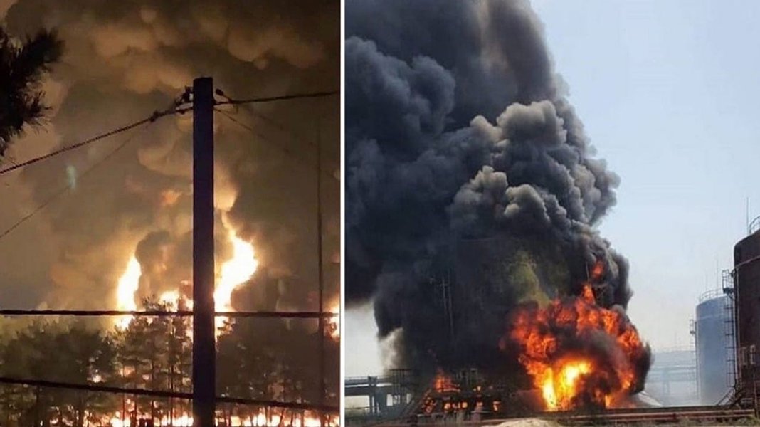 В 05:01 российский чиновник сообщил, что загорелась нефтебаза, расположенная в Суражском районе Брянской области, по состоянию на тот момент площадь пожара составила 1,8 тысяч квадратных метров.