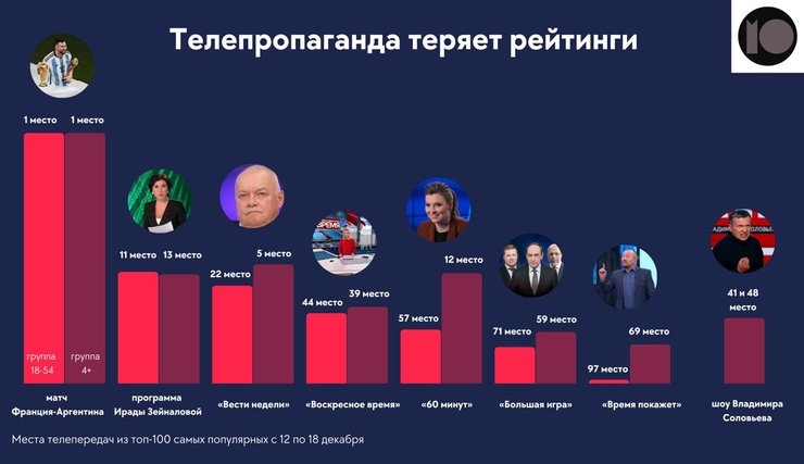 Российская телевизионная пропаганда заметно растеряла рейтинги на фоне трансляций матча Чемпионата мира по футболу-2022 в Катаре. Об этом сообщил в Telegram журналистский проект "Можем объяснить" со ссылкой на данные Mediascope.
