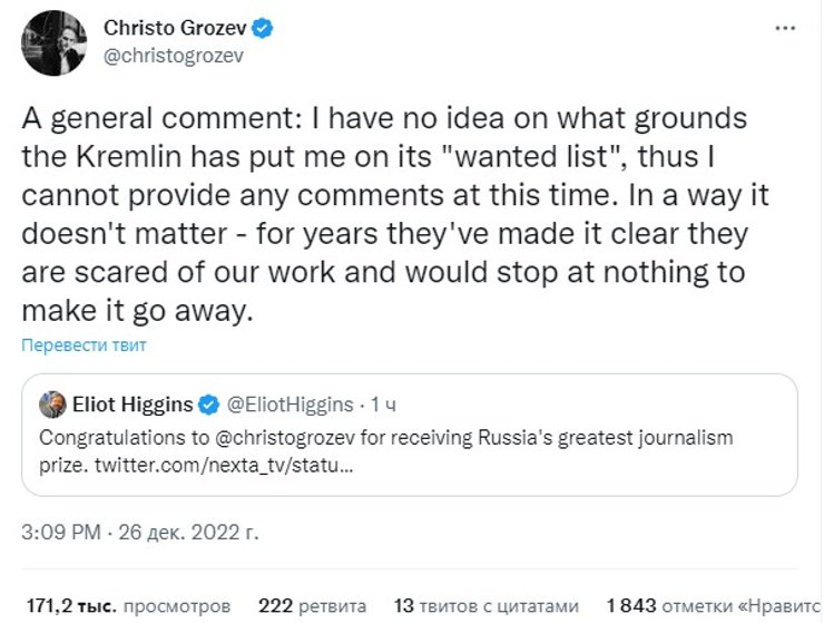 Источник РИА сообщил, что против журналиста возбуждено уголовное дело о распространении недостоверной информации о Вооруженных силах РФ. Вместе с тем сам Грозев сообщил, что причина розыска ему неизвестна.