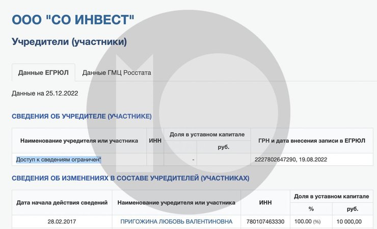 Российская налоговая спрятала информацию о компании Любови Пригожиной, на которую оформлена недвижимость приближенной к президенту РФ семьи.