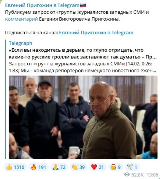 Российский бизнесмен и владелец ЧВК "Вагнер" Евгений Пригожин 14 февраля признался, что создал и долгое время руководил "Агентством интернет-исследований", которую в сети называют "фабрикой троллей". Об этом он сообщил в Telegram в ответ на запрос изданий Forbidden Stories, The Observer, The Guardian, Le Monde, Tamedia, Der Standard и ZDF.