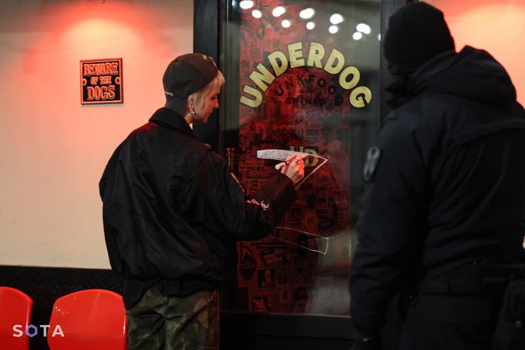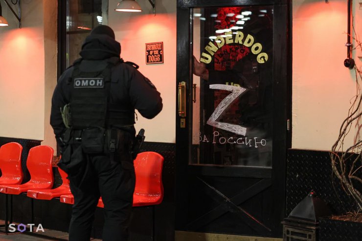 Сообщается, что около 10 вечера ОМОН уехал из заведения, при этом одного из посетителей правоохранители заставили написать на дверях "Z — за Россию".