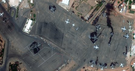 В аэропорту в столице Судана в Хартуме стоят самолеты, поврежденные в результате боевых действий между Силами оперативной поддержки и армией. Спутниковые снимки показала 17 апреля американская компания Maxar Technologies.