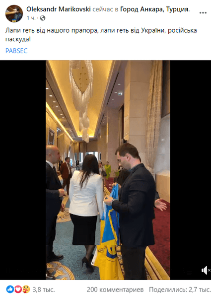 После потасовки нардеп Александр Мариковский опубликовал на своей Facebook-странице видео драки и призвал российскую сторону не трогать украинский флаг.