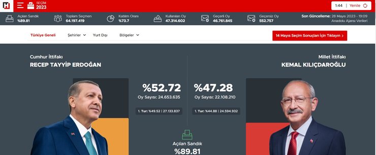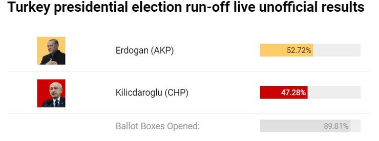 Согласно информации турецкого новостного агентства Нuriyet, по состоянию на 19:15 голоса с пользу Эрдогана и Кылычдароглу составляли 52,61% и 47,39 по результатам подсчета 91,55% бюллетеней.