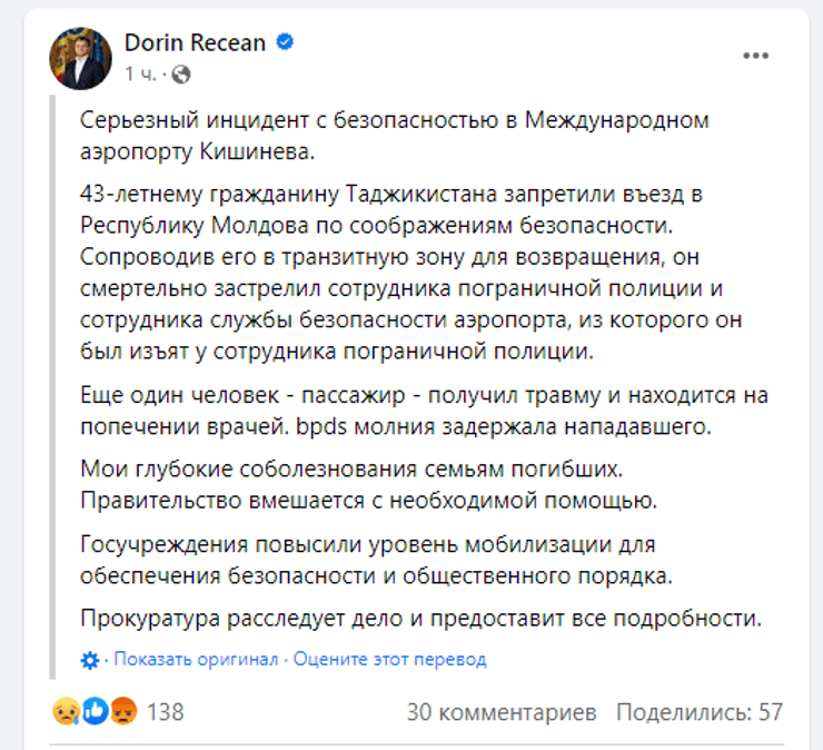 Премьер-министр Молдовы Дорин Речан раскрыл информацию о нападавшем, который открыл стрельбу в аэропорту Кишинева. Об этом глава правительства написал 30 июня на своей Facebook-странице.