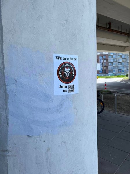 На рекламных наклейках формата А5 была надпись: "Мы здесь. Присоединяйтесь" — то есть "Мы здесь. Присоединяйтесь к нам" и QR-код, который после сканирования ведет на русскоязычный информационный сайт "вагнеровцев". Они были наклеены на стенах зданий не только в Кракове. Сообщения о тех же материалах стали поступать и из Варшавы. Полиция тут же взялась за дело.