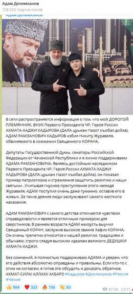 "В сети распространяется информация о том, что мой дорогой племянник, внук первого президента ЧР, героя России Ахмата-Хаджи Кадырова, Адам Рамзанович Кадыров избил обвиняемого Никиту Журавля, обвинения. Будучи достойным наследником первого президента ЧР, он показал пример патриотизма и стремления защитить религию и наши святыни. Учитывая гнусное преступление этого нелюдя Журавля, Адам поступил очень гуманно, оставив его в живых. За такие действия люди заслуживают жесточайшего наказания", — написал он.