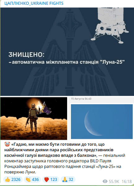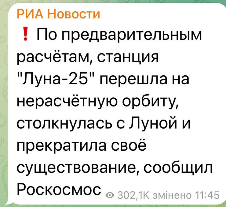 Как известно, запуск "Луны-25", о котором так много и гордо писали росСМИ, в итоге обернулся большим разочарованием. Первая лунная миссия в современной истории РФ, стартовавшая с космодрома "Восточный" 11 августа, бесславно завершилась 19 августа, когда "Роскосмос" сообщил, что произошла "нештатная ситуация", которая помешала технике перейти на предпосадочную орбиту с заданными параметрами.