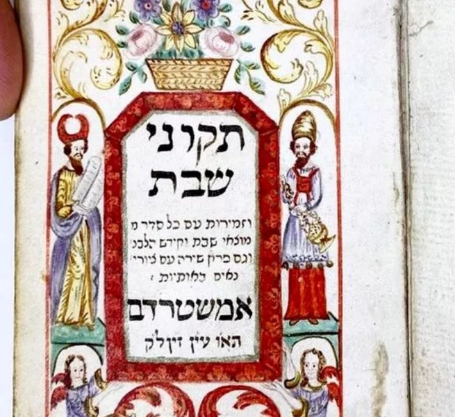 На титульной странице еврейского молитвенника можно увидеть Моисея, который держит две скрижали с десятью заповедями. Его брат Аарон одет в одежду первосвященника. Содержание книги включает субботние гимны, молитву и песни.