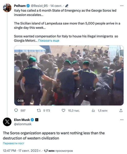 По мнению основателя SpaceX, именно Сорос якобы провоцирует чрезвычайное положение в Италии, поскольку его фонд может заниматься вопросом мигрантов.