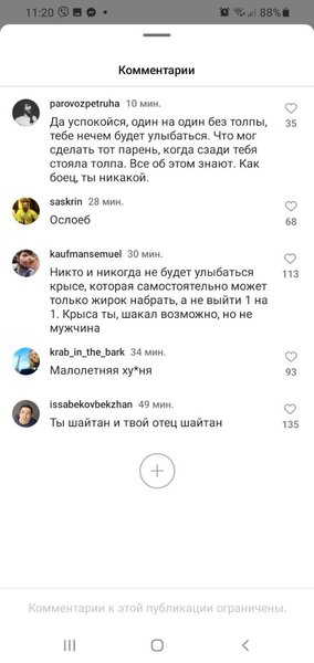 В ответ в комментариях нашлись те, кто его раскритиковал. Неприятные комментарии относительно персоны Кадырова-младшего и избиения подозреваемого под публикацией начали исчезать, также он ограничил возможность комментирования.