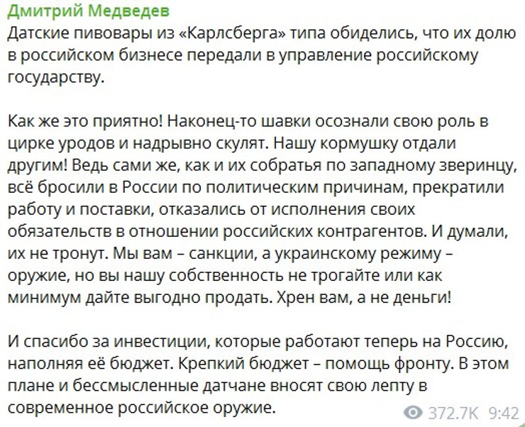 "Деньги пойдут на оружие для России": Медведев объяснил национализацию Carlsberg и обозвал датчан