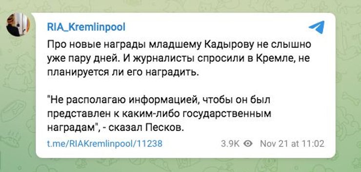 "Кадырова-младшего начали троллить даже в Кремле. Песков сообщил, что представлять Адама Кадырова к госнаградам пока не собираются", — говорится в сообщении.
