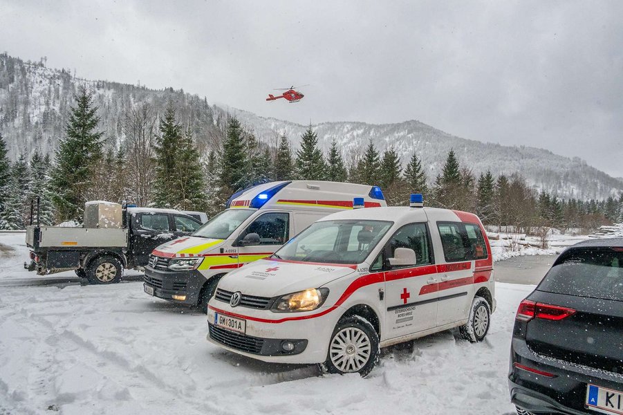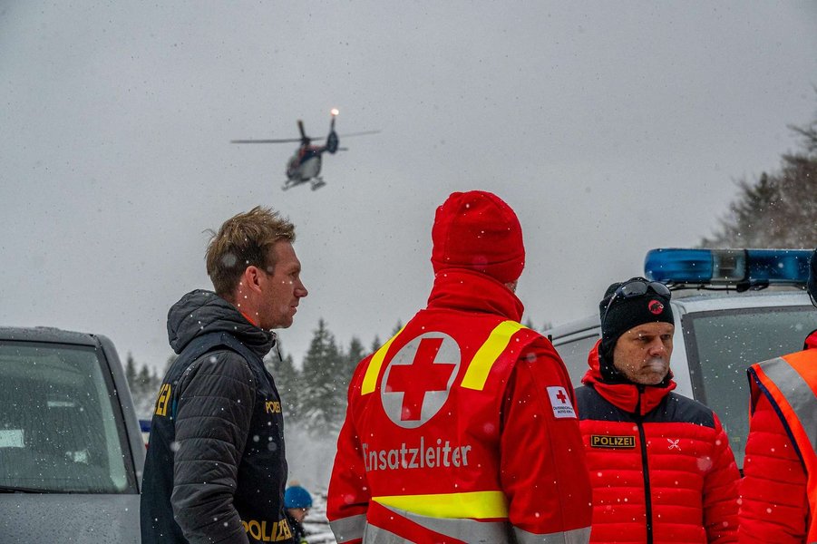 На фотографиях, опубликованных ORF, показывают вертолет спасателей, который участвовал в поисковых работах. Вокруг — засыпанная снегом местность, покрытая несколько сантиметровым слоем снега.