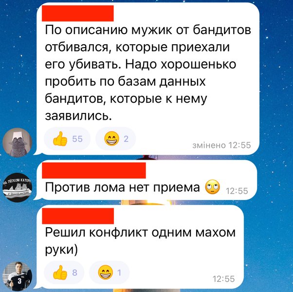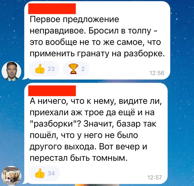 Комментаторы отмечают, что граната против трех мужчин была применена справедливо, ведь они "приехали его убивать" и не оставили другого выбора.