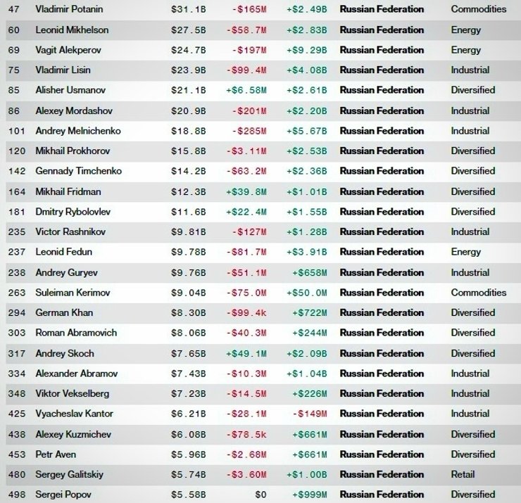 Кроме того, в прошлом году среди российских миллиардеров больше всего разбогатели основатель "Лукойла" Вагит Алекперов — на $9,29 млрд, до $24,7 млрд, соучредитель компаний "Еврохим" и СУЭК Андрей Мельниченко — на $5,67 млрд, до $17,42 млрд. В список вошел и основатель НЛМК Владимир Лисин, состояние которого выросло на $4,08 млрд, до $23,9 млрд.