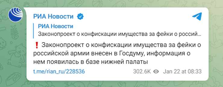 В Государственную думу России внесли законопроект, которым предусматривается у россиян, которые якобы распространяют фейки об армии РФ, конфисковывать имущество. Об этом сообщает российское издание "Риа-Новости".