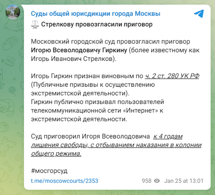 "Игорь Гиркин признан виновным по ч. 2 ст. 280 УК РФ (публичные призывы к осуществлению экстремистской деятельности). Гиркин публично призывал пользователей телекоммуникационной сети "Интернет" к экстремистской деятельности", — говорится в сообщении.