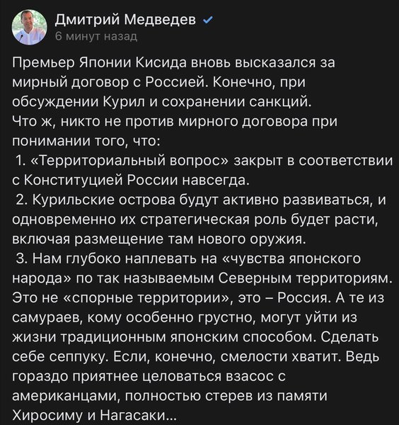 "Это — не "спорные территории", а Россия. А те самураи, кому особенно грустно, могут закончить жизнь традиционным японским способом, совершив сэпуку", — предложил японцам Медведев.