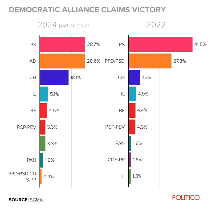 Chega, выступающая против истеблишмента, присвоившая лозунг Estado Novo "Бог, страна, семья и работа", закрепилась в качестве третьей по величине политической силы Португалии и теперь контролирует по меньшей мере 48 из 230 мест в парламенте. И даже если она останется в одиночестве, результат выборов укрепил ее мощное политическое присутствие в Португалии.