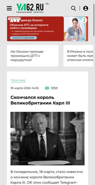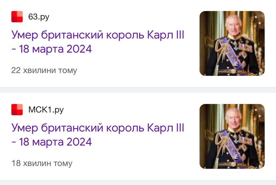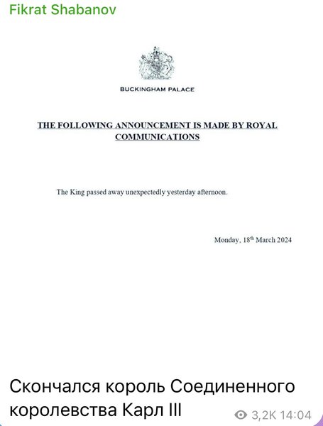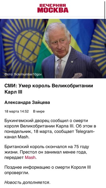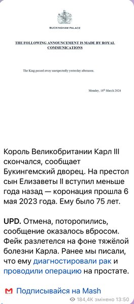 Около 13:00 в различных российских Telegram-каналах и на страницах средств массовой информации появились новости о якобы смерти короля Соединенного Королевства и еще 14 стран Содружества наций Чарльза III (или Карла III).