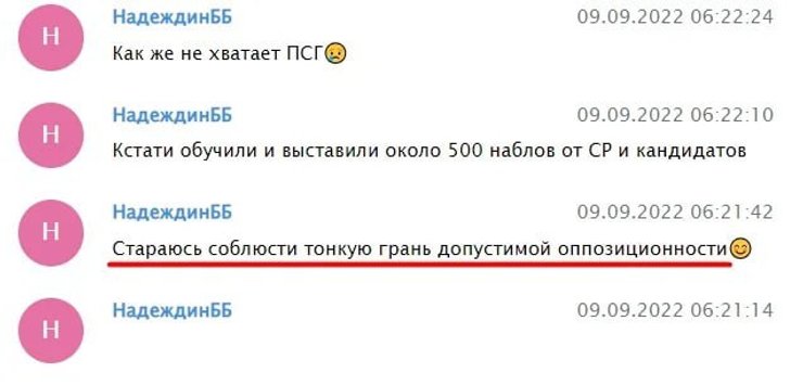 Согласно скриншотам переписки, на выборах мэра Москвы в 2022 году Борис Надеждин охарактеризовал свою политическую деятельность следующими словами: "Стараюсь соблюсти тонкую грань допустимой оппозиционности".