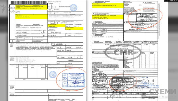 Один из этих документов, датированный концом января 2023 года, содержал печати казахстанской компании-поставщика, польской компании-получателя, а также информацию о том, что палисад из сосны отправлен из Казахстана в Польшу. Также на документе были печати Министерства финансов Казахстана и перевозчика — белорусской компании "Галлардо".