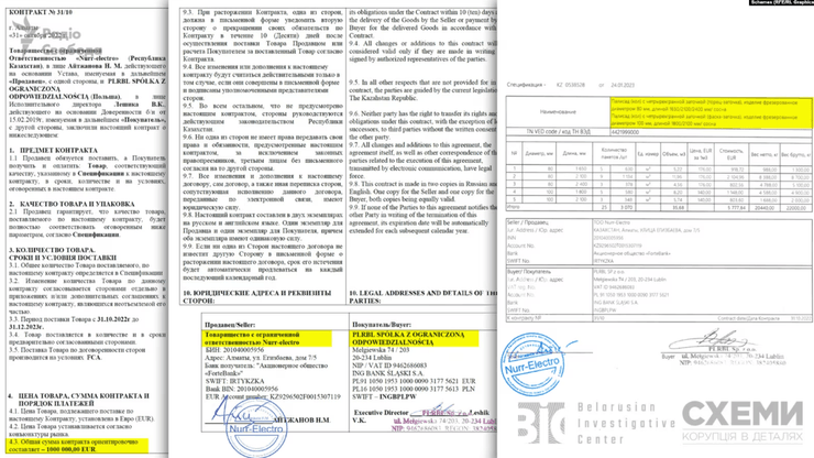 Предоставленный журналистам пакет документов, касающихся поставок древесины из Казахстана в Польшу, содержал контракт на сумму почти миллион евро между казахстанской компанией Nurr-electro и польской компанией PLRBL, а также данные по спецификации товара и таможенные декларации.
