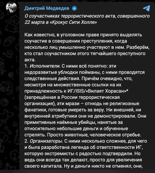 "Нацистская Украина" и Макрон: Медведев назвал организаторов теракта в "Крокусе"
