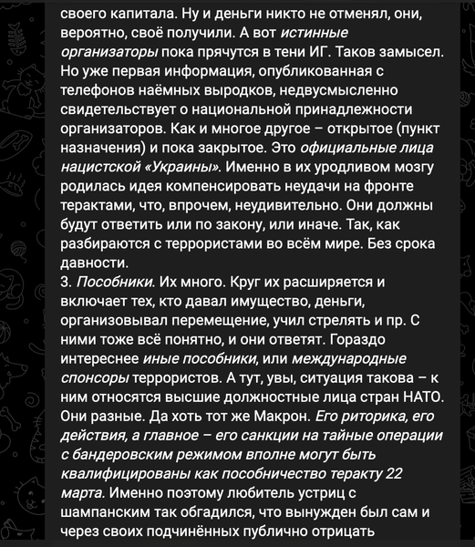 "К ним относятся высшие должностные лица стран НАТО. Они разные. Да хоть тот же Макрон. Его риторика, его действия, а главное — его санкции на тайные операции с бандеровским режимом вполне могут быть квалифицированы как пособничество теракту 22 марта. (...) Очевидно, что Макрон и ряд других западных руководителей — спонсоры этого ужасного теракта", — отметил заместитель председателя Совета Безопасности РФ.