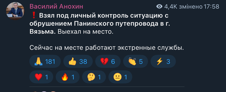 "Взял под личный контроль ситуацию с обрушением Панинского путепровода в г. Вязьма. Выехал на место", — сказал Василий Анюхин.