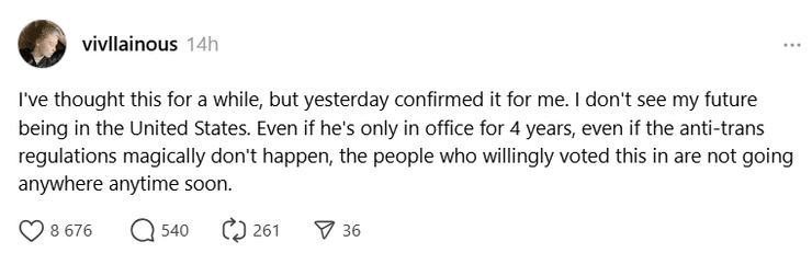 "Я давно об этом думала, но вчера окончательно убедилась. Я не вижу своего будущего в Соединенных Штатах. Даже если он (Трамп — ред.) будет у власти всего 4 года, даже если антитранс законы каким-то чудом не примут, люди, которые сознательно проголосовали за это, никуда не исчезнут в ближайшее время", — написала Вивиан.