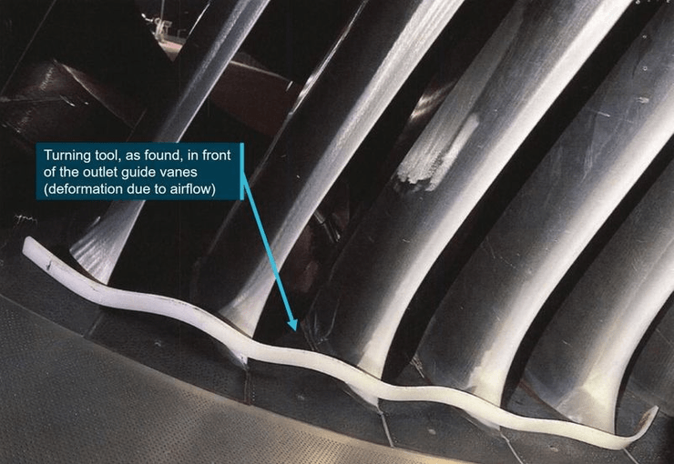Инженеры по техническому обслуживанию не заметили, что инструмент был оставлен в корпусе компрессора низкого давления двигателя, когда проводили проверки на наличие посторонних предметов по завершении проверки с помощью бороскопа.