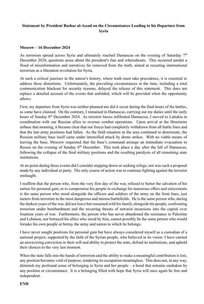В опубликованном заявлении сирийского президента, он объяснил, как и почему вынужден был бежать из Сирии.