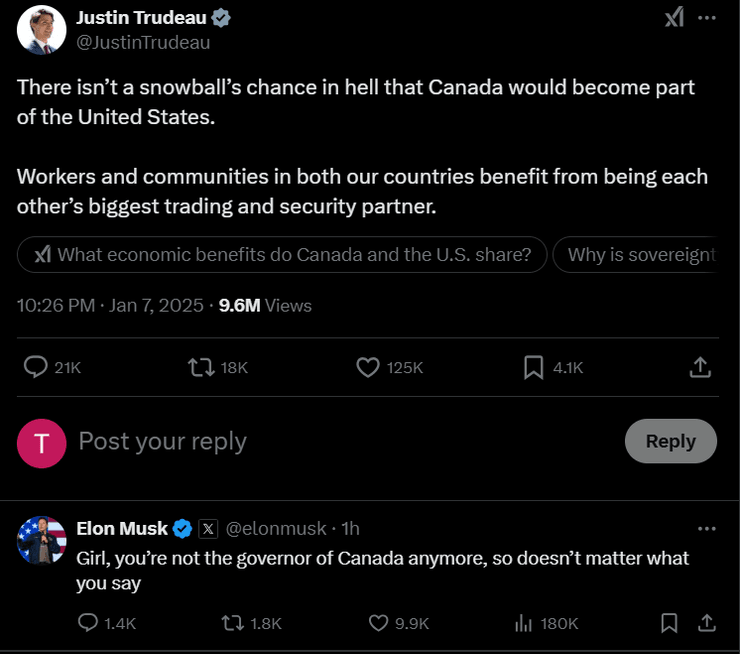 Илон Маск назвал уходящего премьера Канады Трюдо "девушкой". Так он прокомментировал заявление Трюдо, что Канада абсолютно точно не присоединится к США.
