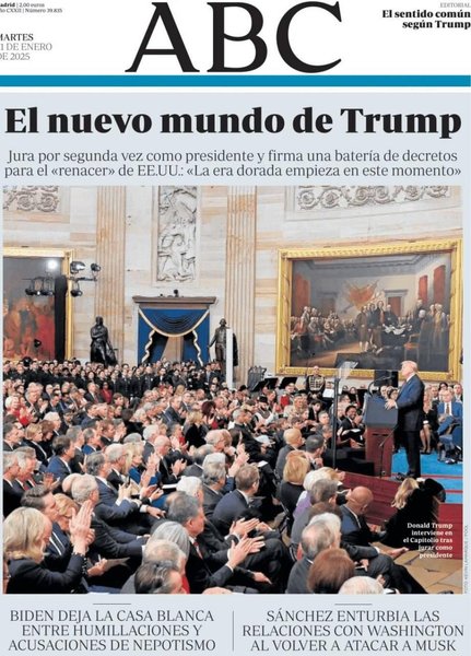 "Он вернулся… и ведет войну со всем", — пишет Daily Mirror, в то время как Times подчеркивает то, что она называет "далеко идущей и воинственной политической повесткой Трампа". Португальское издание Рublico цитирует самого Трампа, заявляя, что "упадок Америки закончился".