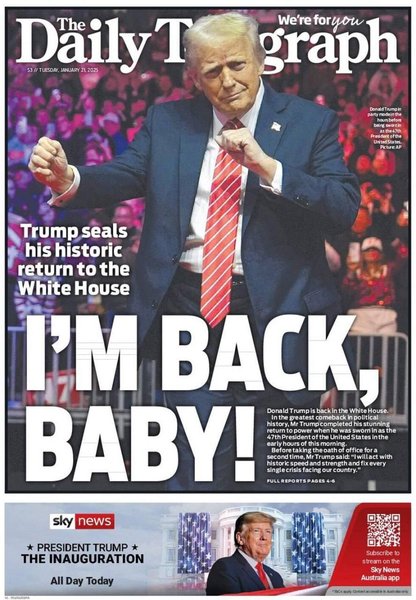 "Unleashed" — заголовок в iPaper, который указывает на иронию осужденного преступника, обещающего преобразовать то, что он назвал "упадком страны". Но Financial Times утверждает, что Трамп возвращается в Белый дом с более широкой поддержкой, чем когда он ушел в 2021 году.