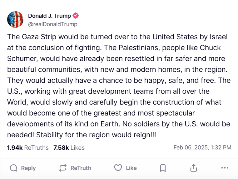 Во время совместной пресс-конференции с премьер-министром Израиля Беньямином Нетаньяху в Белом доме 5 февраля Дональд Трамп говорил, что США возьмут Сектор Газа "под контроль", а местных палестинских жителей переселят в другие страны. Он пообещал превратить эту территорию в "Ривьеру Ближнего Востока" и заверил, что там будут жить "люди со всего мира". По его словам, Соединенные Штаты очистят земли Сектора Газа от неразорвавшихся бомб и снарядов, снесут разрушенные здания и проведут реконструкцию, которая создаст тысячи рабочих мест и "избавит палестинцев от боли и расходов на новое восстановление".
