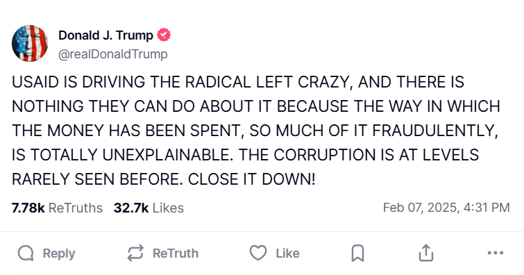 "Радикальные левые сходят с ума из-за USAID. И они ничего не могут с этим поделать, потому что способ, которым были потрачены эти деньги, причем значительная их часть, был мошенническим и совершенно непонятным", — написал 47-й президент Соединенных Штатов.