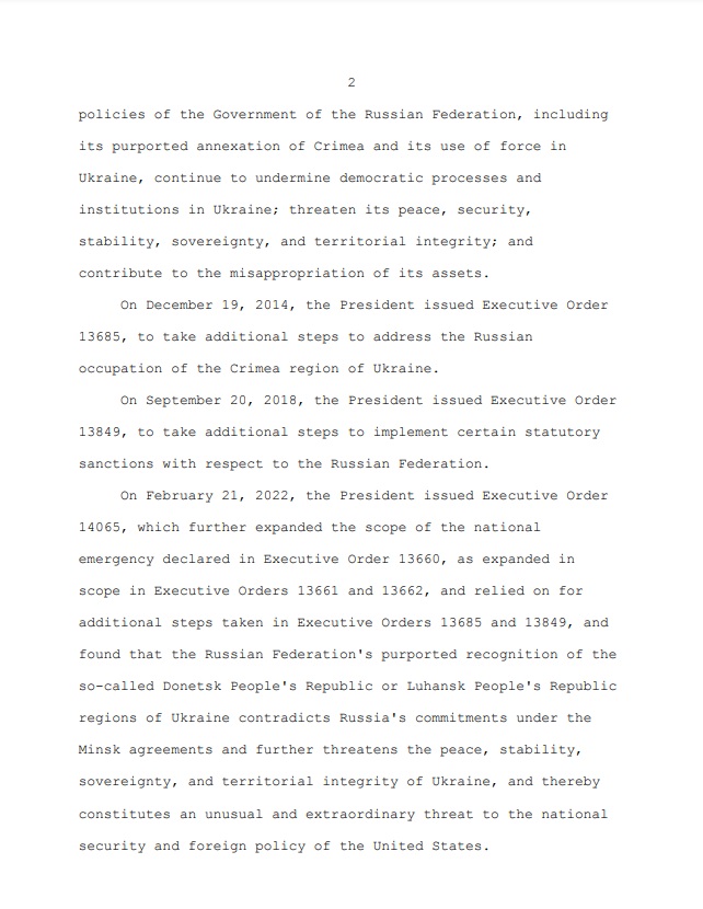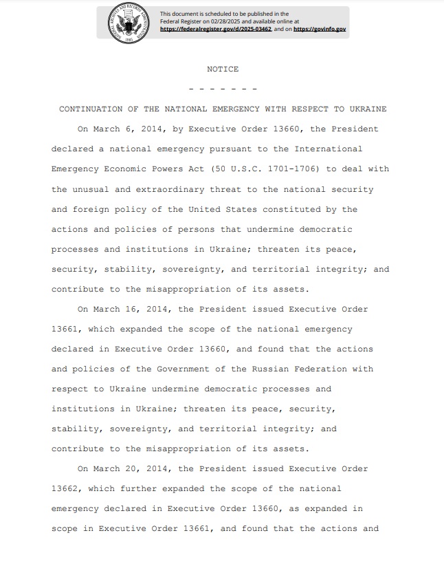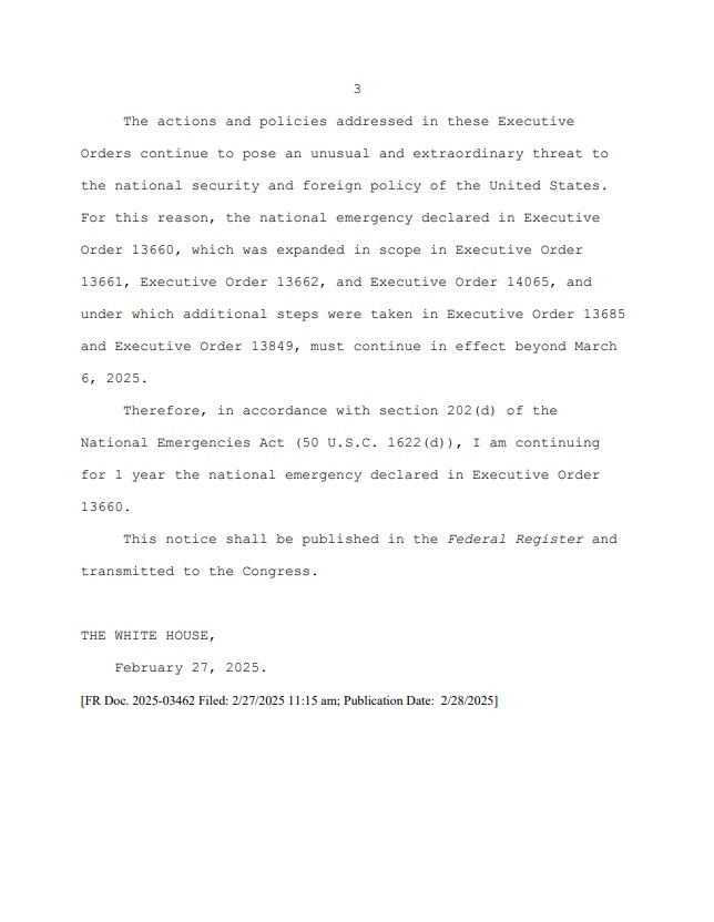 "Я продлеваю на 1 год чрезвычайное положение в стране, объявленное в Указе 13660. Это уведомление должно быть опубликовано в Федеральном реестре и передано в Конгресс", — сказано в конце документа и указано, что он подписан в Белом доме 27 февраля 2025 года.