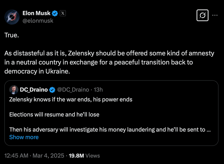 Глава Департамента эффективности правительства США (DOGE) заявил, что Зеленскому "стоит предложить амнистию в нейтральной стране" для "мирного перехода к демократии".