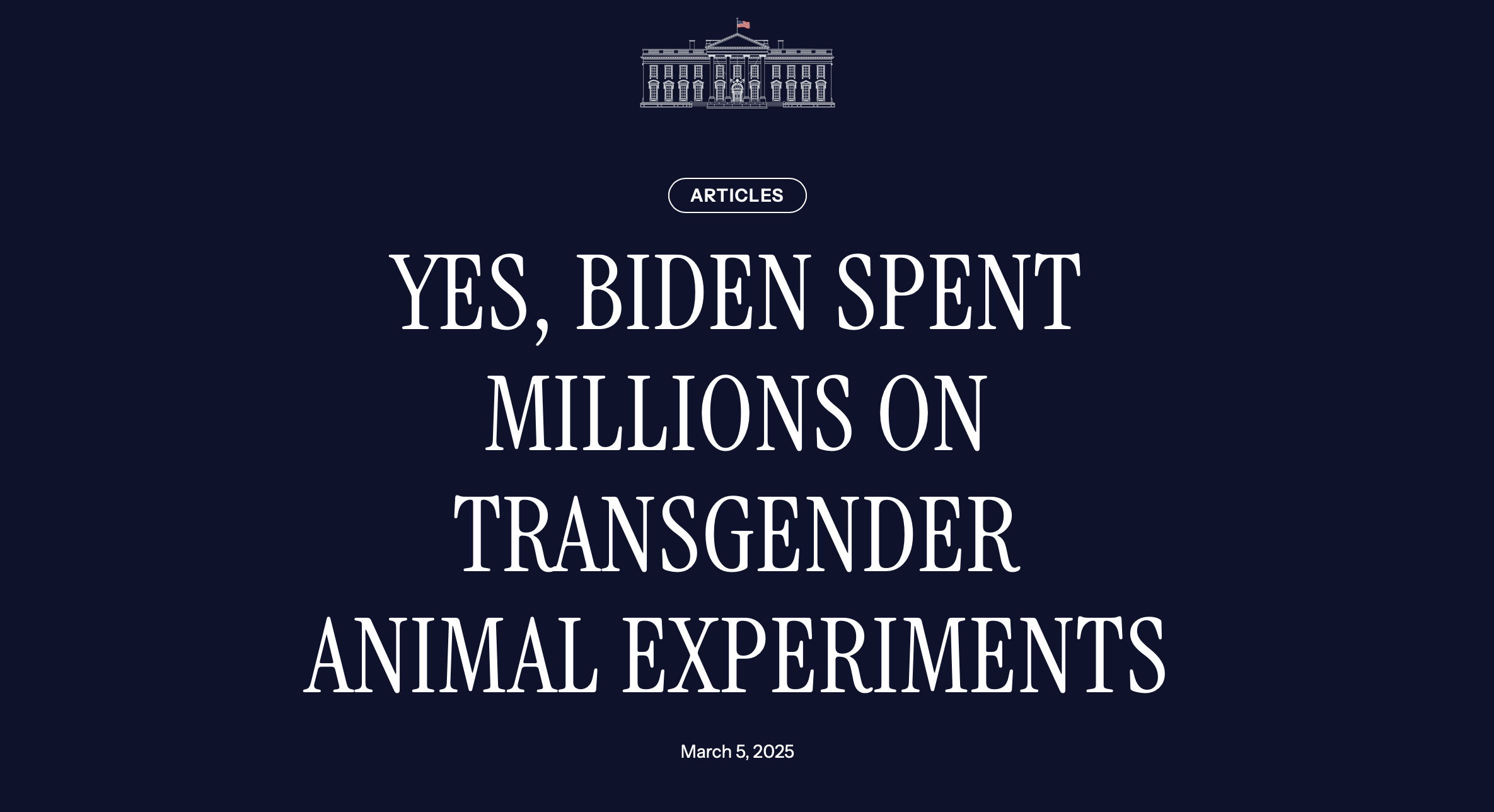 Администрация президента США Дональда Трампа настаивает на том, что примером расточительства Джо Байдена являются 8 миллионов долларов, потраченных "на то, чтобы сделать мышей трансгендерными". Соответствующее заявление появилось на сайте Белого дома в начале марта 2025 года.
