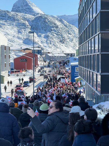 Около 1000 гренландцев под лозунгом "Гренландия принадлежит гренландскому народу" вышли на марш в столице страны Нууке, протестуя против высказываний президента США Дональда Трампа о суверенитете их страны.