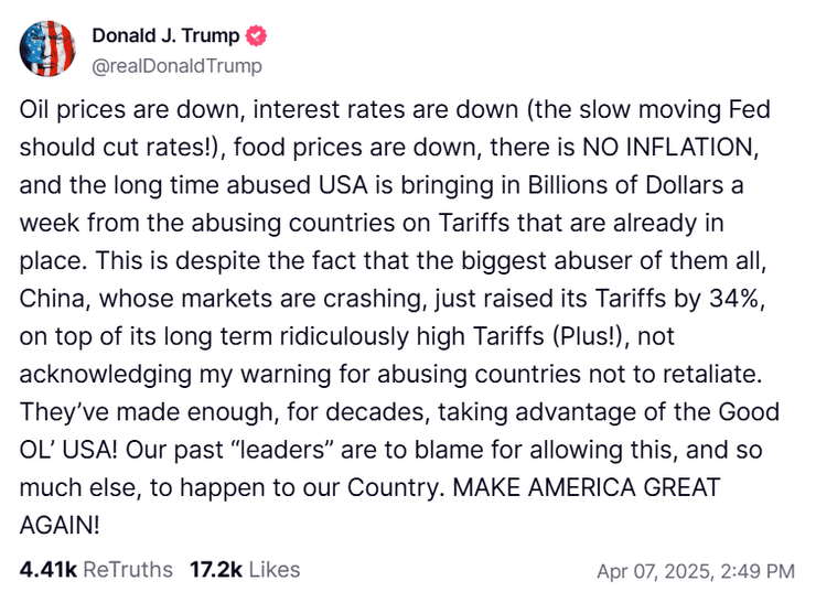 По его мнению, США довольно долго подвергались эксплуатации и главным эксплуататором стал Китай, рынок которого переживает крах. Пекин тем временем ввел против Штатов ответные пошлины в размере 34%