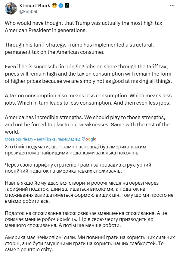 "Даже если ему удастся привлечь рабочие места в США с помощью тарифного налога, цены останутся высокими, а налог на потребление останется в форме более высоких цен, потому что мы просто не так хороши в производстве всех вещей. Налог на потребление также означает меньшее потребление. А это означает меньшее количество рабочих мест. Что, в свою очередь, приводит к меньшему потреблению. А затем еще меньшему количеству рабочих мест", — пояснил Маск-младший к чему приведет торговая война президента США.