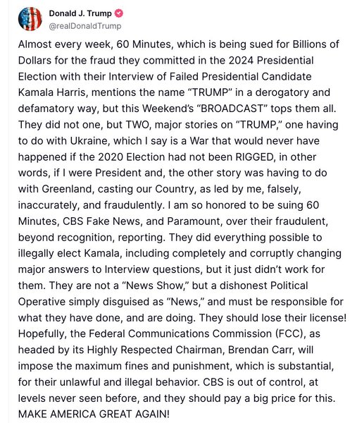 В своей заметке Трамп также заявил, что шоу "60 Minutes" больше не является журналистикой, а скорее "политически мотивированными операциями под видом новостей", за что они должны нести ответственность.