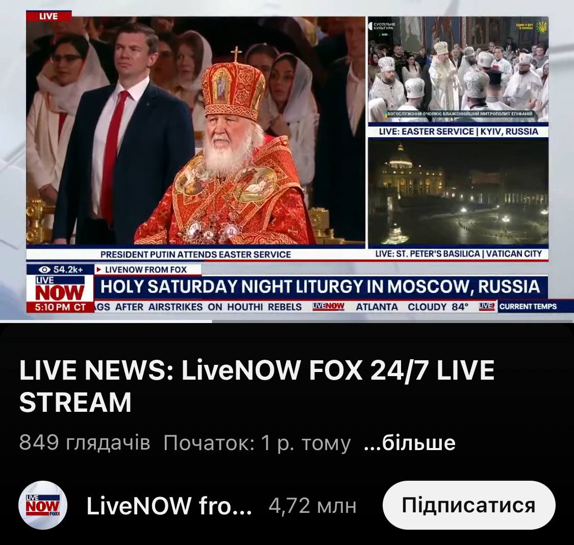 Так, в эфире Fox News демонстрировали трансляцию службы в РФ, которую проводил патриарх Кирилл, а на ее фоне параллельно появились еще два видео. Одно из них — служба в Свято-Михайловском соборе в Киеве. Кадры подписали "Вживую: Пасхальная служба. Киев. Россия".