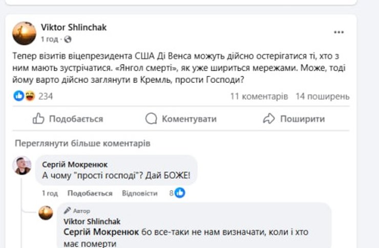 "Теперь визитов вице-президента США Ди Венса могут действительно остерегаться те, кто с ним должны встречаться. "Ангел смерти", как уже распространяется по сетям. Может, тогда ему стоит действительно заглянуть в Кремль, прости Господи?" — написал Шлинчак.
